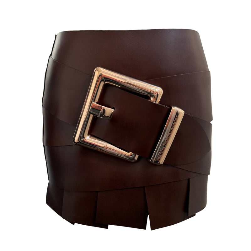 inspired by the dynamic silhouette of a tennis skirt, the Midi Big Buckle Strapskirt offers a fresh interpretation of marina hoermanseder’s signature design.